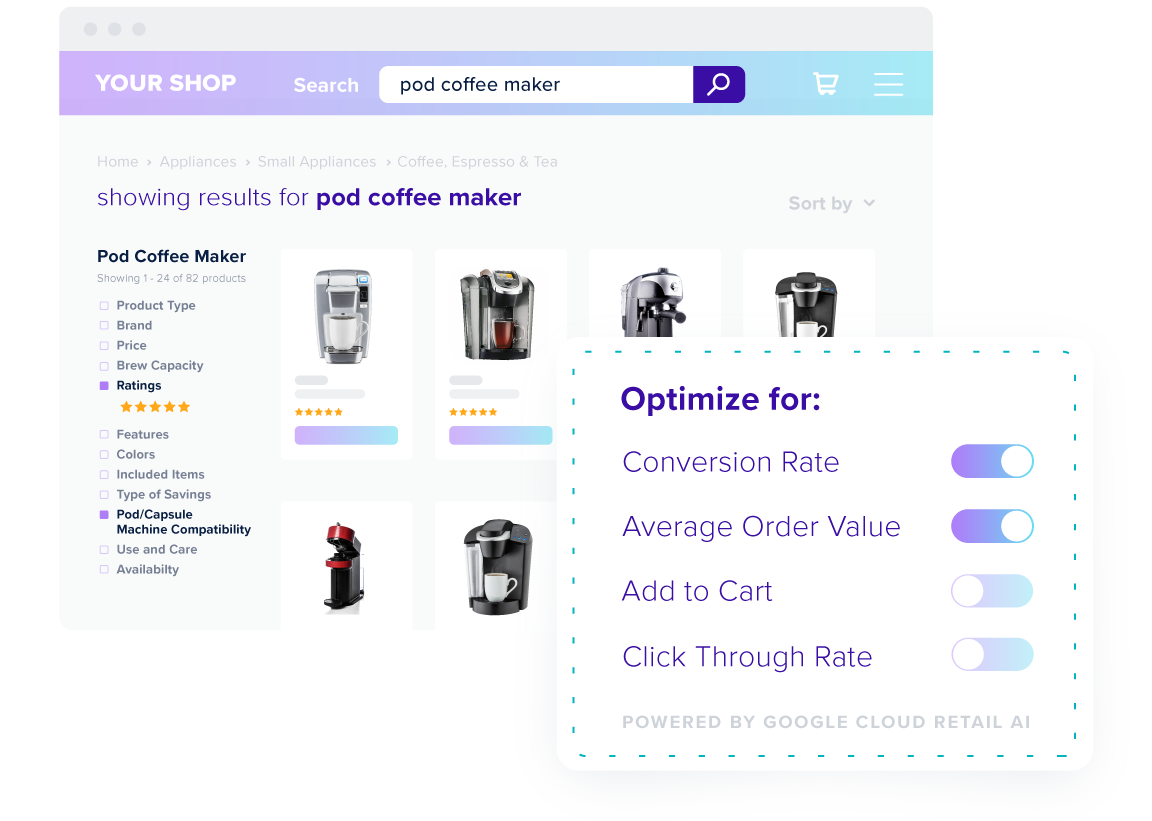 - Leverage both online and in-store data, as well as user buying history to perform search at scale, without human intervention, and increase conversion